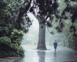 “Aku suka mendengarkannya sembari berlari kecil di sepanjang jalan yang melingkari danau. Dan aku juga suka hujan.”